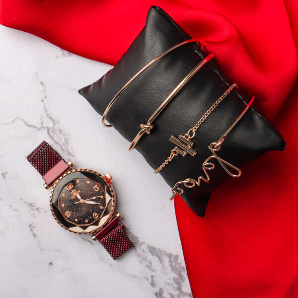 Komplektā iekļauts moderns pulkstenis ar rose gold toni un sietveida siksniņu, kas sniedz komfortu ikdienā un uzsver rokas grāciju. Pulksteņa ciparnīca ir izstrādāta ar minimālisma akcentiem un nelieliem dekoratīviem elementiem, kas to padara par universālu aksesuāru — piemērotu gan birojam, gan brīvā laika pasākumiem.