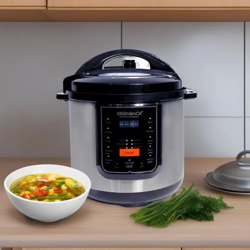 Daudzfunkcionālais elektriskais spiediena katls Eisenbach HW-1900 ar 6L tilpumu un LED vadību piedāvā 8 gatavošanas režīmus, taimeri un 10 drošības funkcijas. Jaudīgs 1000 W sildelements nodrošina ātru uzsildīšanu un uzturvielu saglabāšanu. Ideāli piemērots ģimenes vakariņām un veselīgām maltītēm. Universāls spriegums.