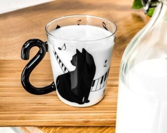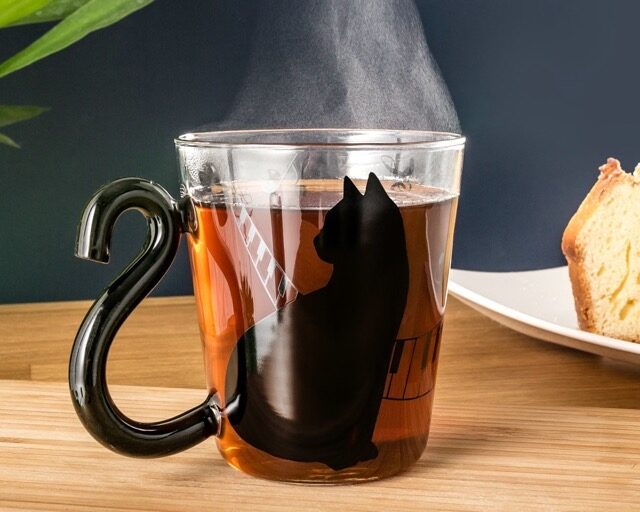 Kaķa silueta stikla krūze ar astes formas rokturi – mūzikas un dzīvnieku mīļotājiem