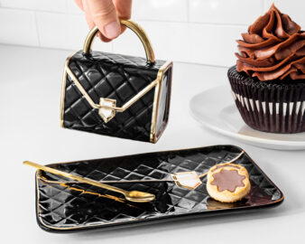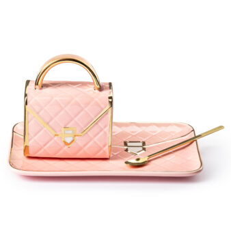 Keramikas krūzes komplekts rokassomas dizainā ar apakštasīti un zelta karotīti ir elegants 300 ml komplekts kafijai vai tējai. Pieejams melnā vai rozā krāsā, ar zelta dekoru un reljefu virsmu, piemērots dāvanai un stilīgam galda noformējumam.