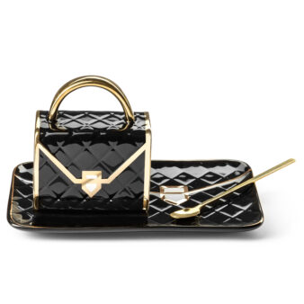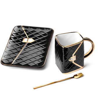Keramikas krūzes komplekts rokassomas dizainā ar apakštasīti un zelta karotīti 300 ml