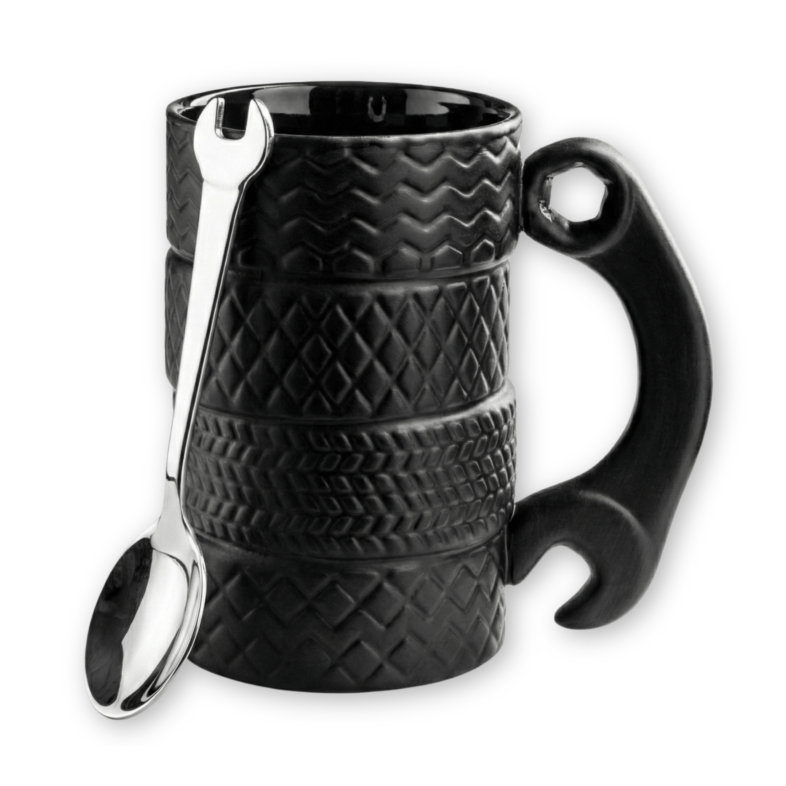 🔍 Keramikas riepu krūze ar uzgriežņatslēgas rokturi un karotīti – dizains, kas izceļas