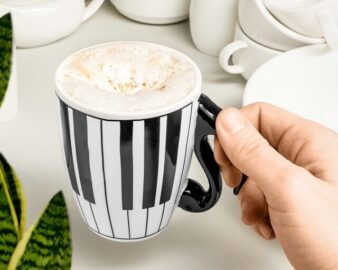 Mūzikas krūze PIANO ar nošu rokturi – porcelāna krūze ar klavieru dizainu