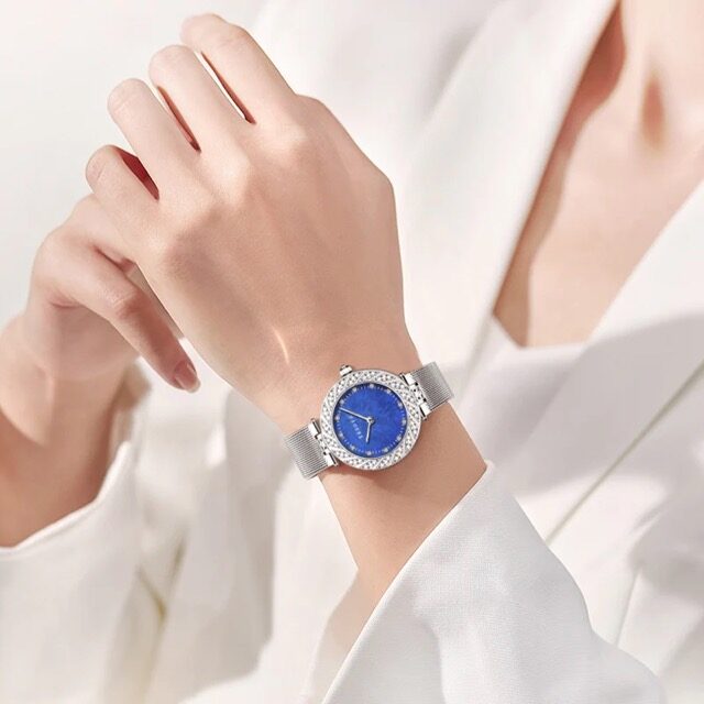 Stilīgs sieviešu kvarca pulkstenis ar zilu ciparnīcu un dekoratīviem kristāliem. Elegants dizains ar metāla sieta siksniņu nodrošina komfortu un pielāgojamību. Kvalitatīvs kvarca mehānisms garantē precīzu laika rādīšanu. Pulkstenis ir ūdensizturīgs, piemērots ikdienas lietošanai. Ideāls aksesuārs sievietei, kura vēlas apvienot praktiskumu ar šarmu.