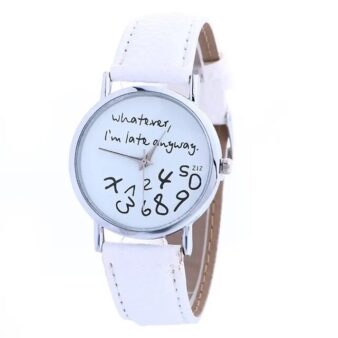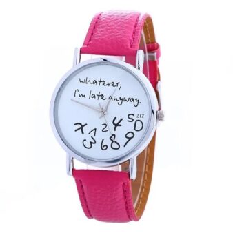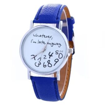 Šis kvarca rokas pulkstenis ar zilu ādas siksniņu ir piemērots ikvienam, kurš novērtē neparastu dizainu un ar smaidu raugās uz ikdienu. Tā ciparnīca izceļas ar savdabīgu dizaina risinājumu – skaitļi haotiski sakrituši apakšējā labajā stūrī, bet virs tiem redzams uzraksts angļu valodā “Whatever, I’m late anyway”, kas tulkojumā nozīmē – “Nu un, tāpat vienmēr kavēju”. Šis pulkstenis nav tikai instruments laika nolasīšanai, bet arī stila elements un personības izpausme.