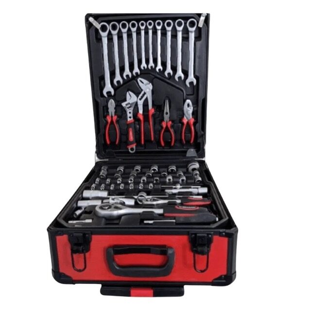 Komplektā ietilpst gan rokas instrumenti (atslēgas, skrūvgrieži, knaibles), gan dažāda izmēra uzgaļi, ligzdas un sprūdrati, kas ļauj veikt darbus precīzi un efektīvi. Visi instrumenti ir pārskatāmi izkārtoti un piestiprināti triecienizturīgā plastmasas korpusā ar ērti aizveramām metāla sprādzēm.