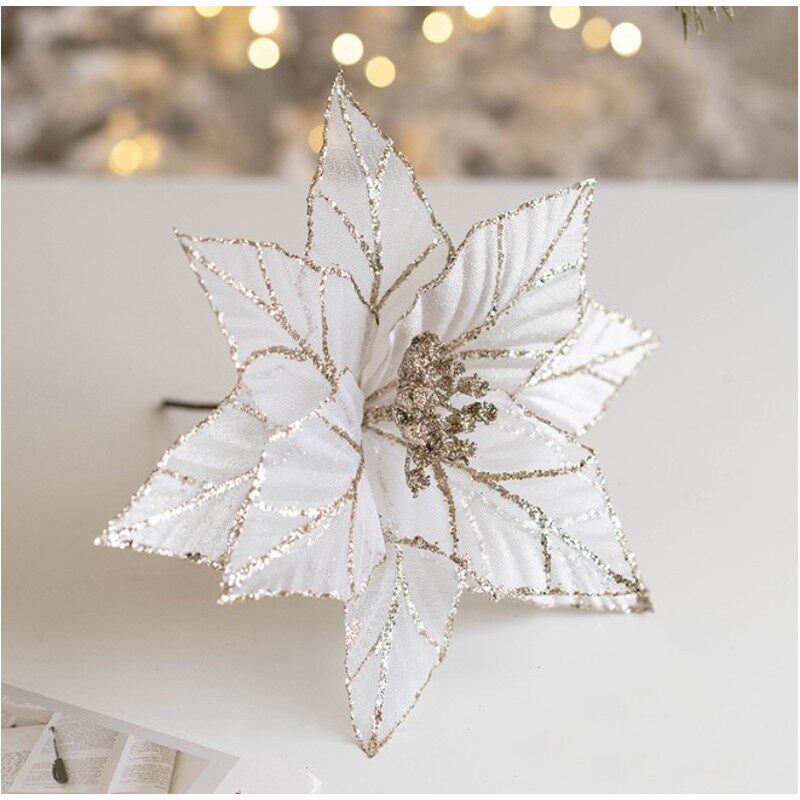 Pievienojot šo gaišo Ziemassvētku ziedu ar zelta maliņām jūsu svētku dekorācijām, jūs piešķirat savam interjeram gaisīgumu, maigumu un izsmalcinātību. Tas ir lielisks veids, kā atdzīvināt gan tradicionālas, gan modernas Ziemassvētku tēmas, un izcili papildina jebkuru kompozīciju.